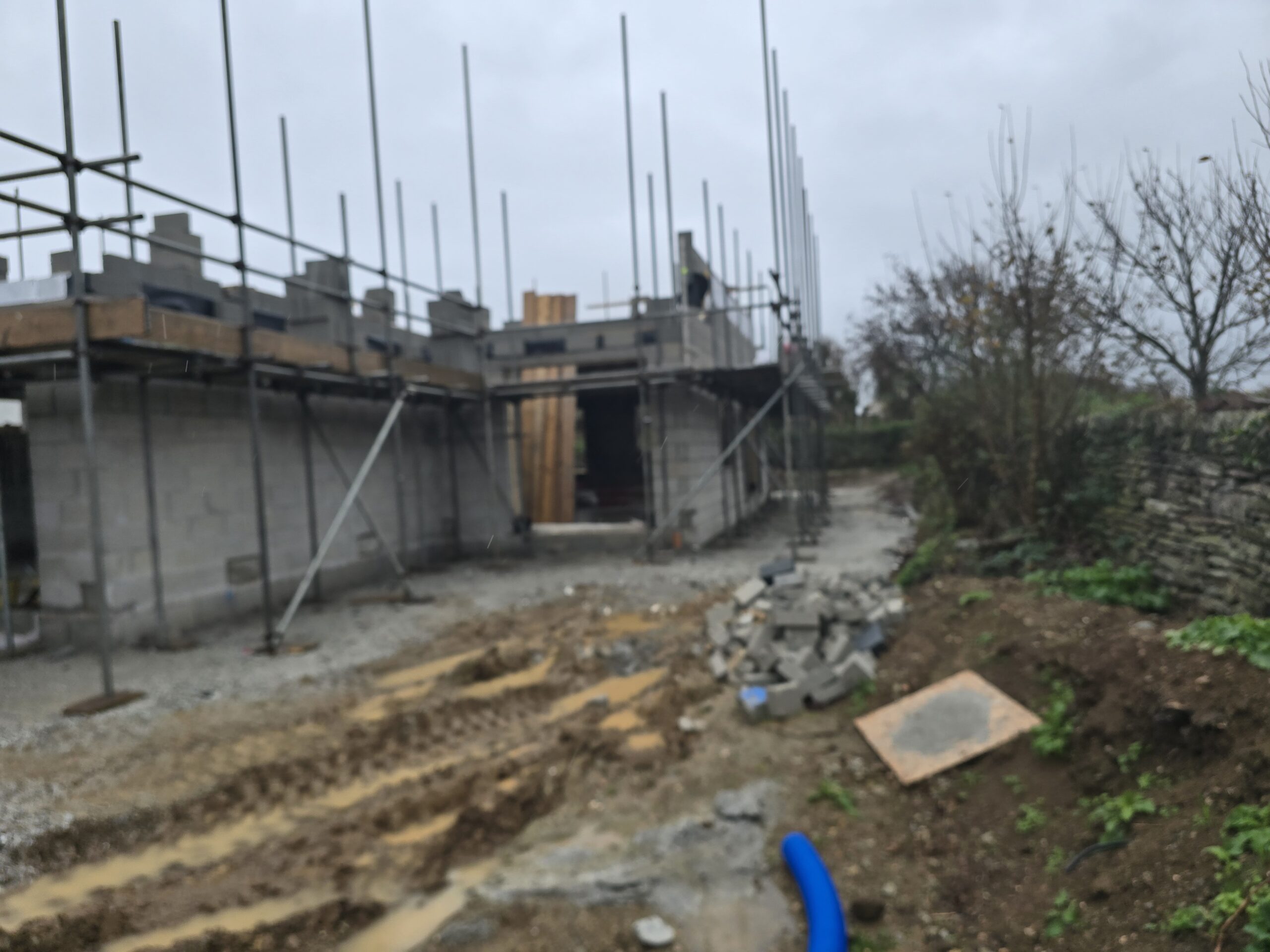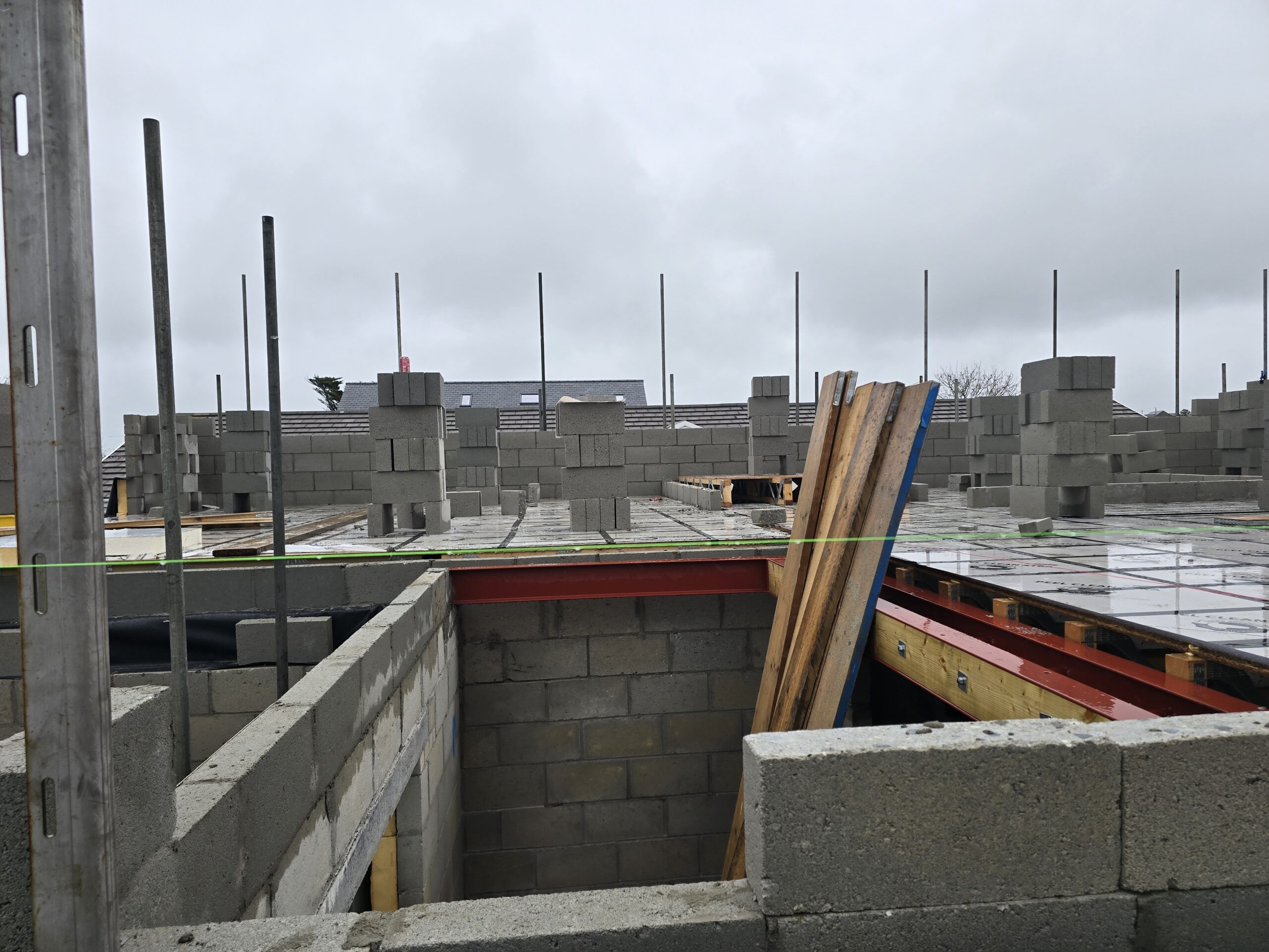 Blockwork now up to 1st floor level, structural steels in place and preparing for Posi Joists next week, trenching for services all done, services/ducts all laid, backfilled and tarmaced