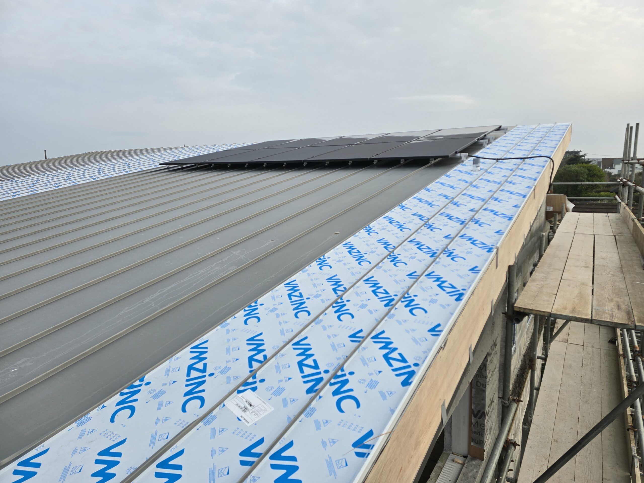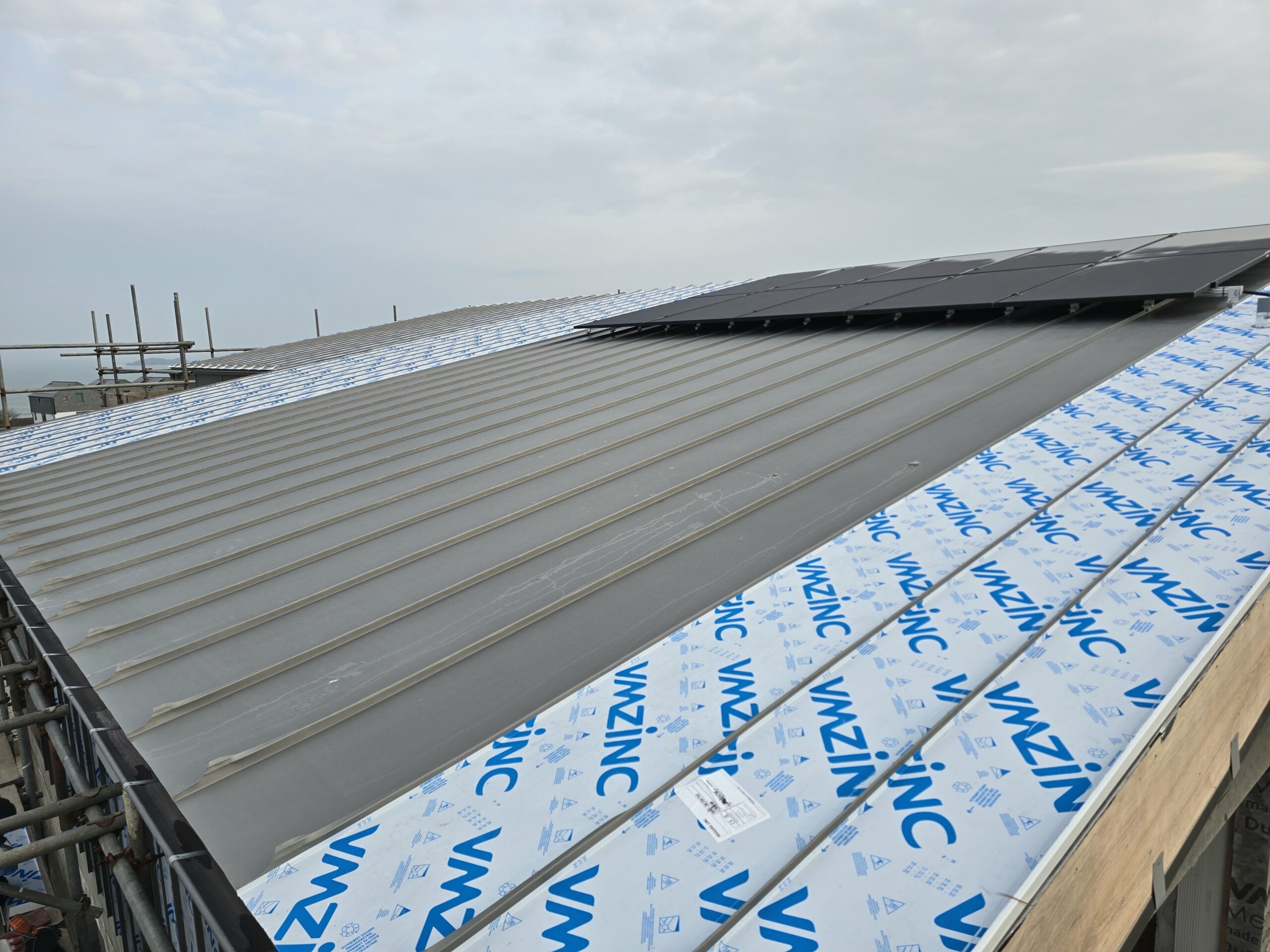 Black Shed now has a completed Zinc roof and the Solar PV have been installed. Our teams focus has turned to 1st fix of plumbing and electrics, whilst our stone masons start work on cladding the external walls.