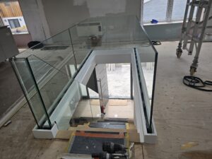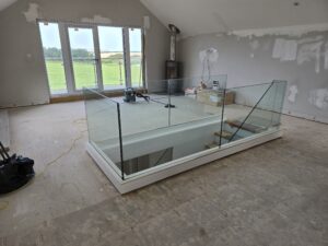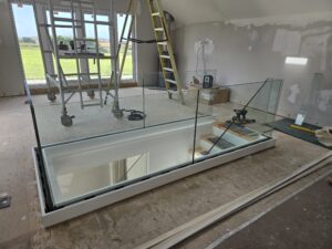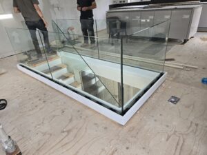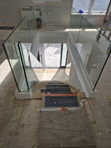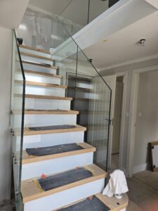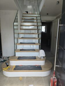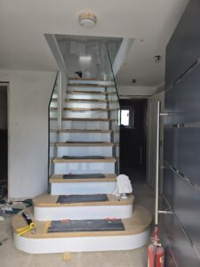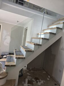 New contemporary staircase with seemless glass ballustrading being installed.