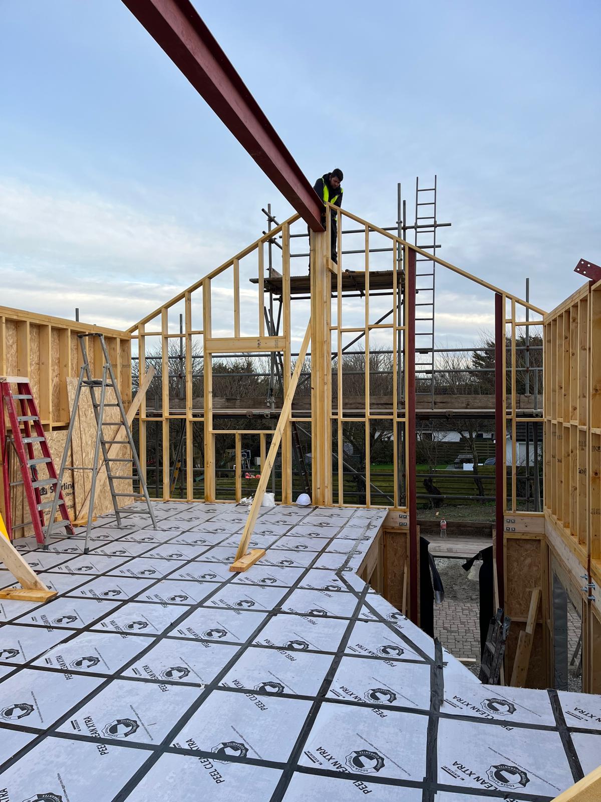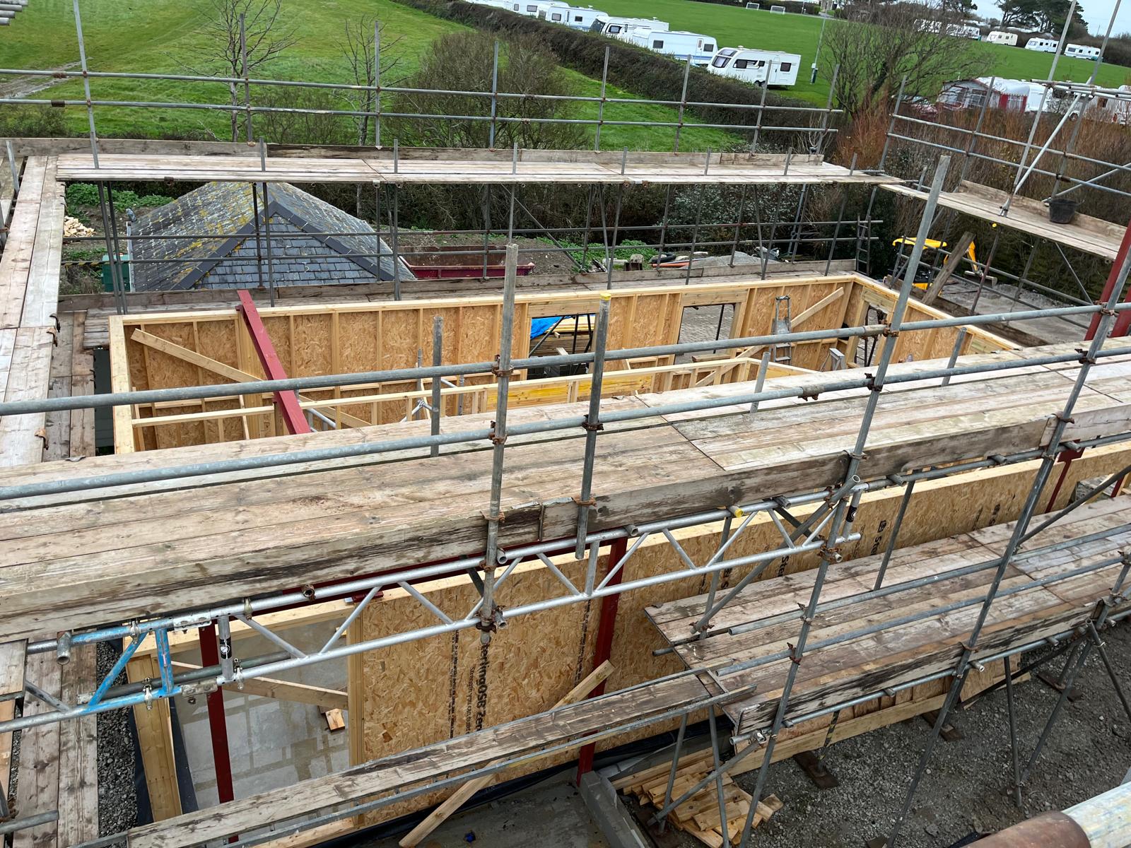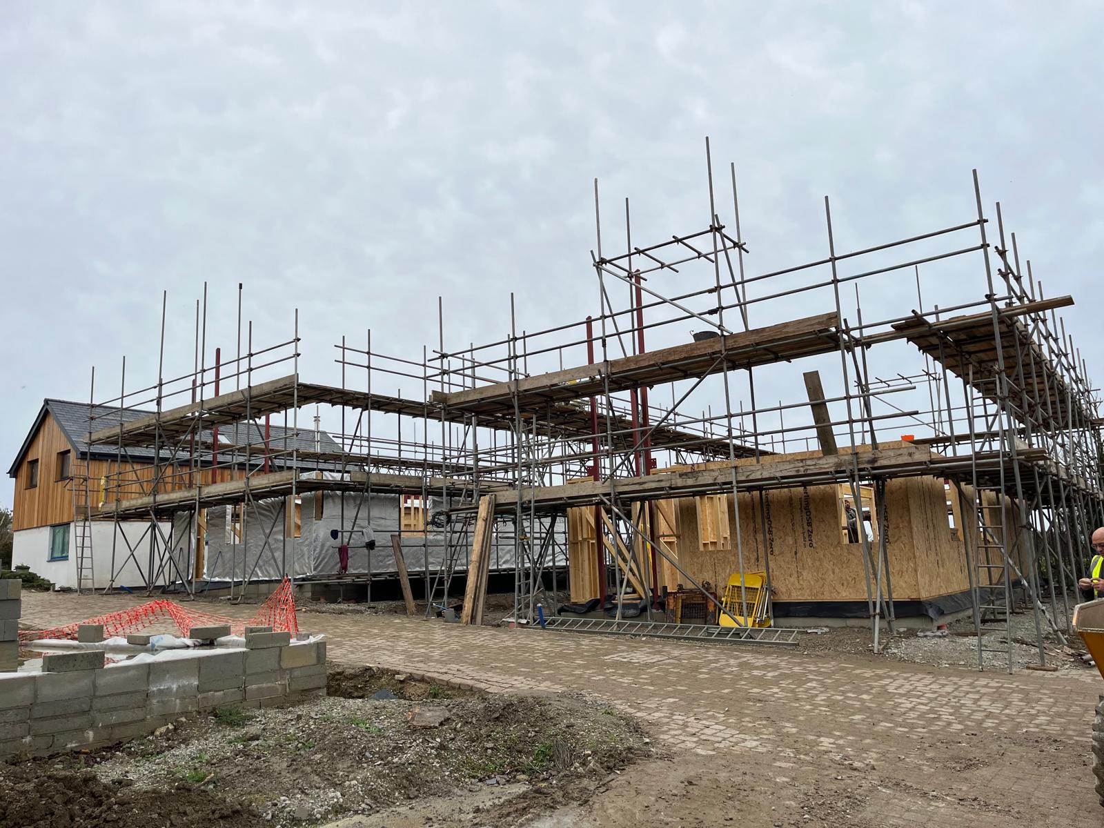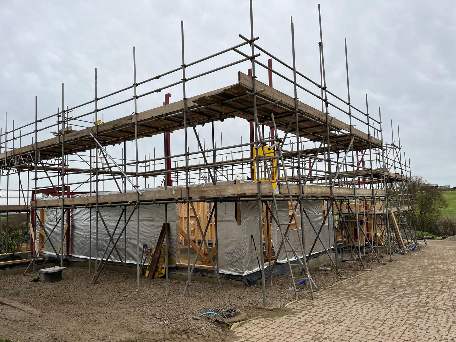 Having now finished the construction of the ground floor frame and installed the internal walls, the focus has been to fit the OSB board and wrap the building, raise the scaffolding and commence the construction of 1st floor framework.