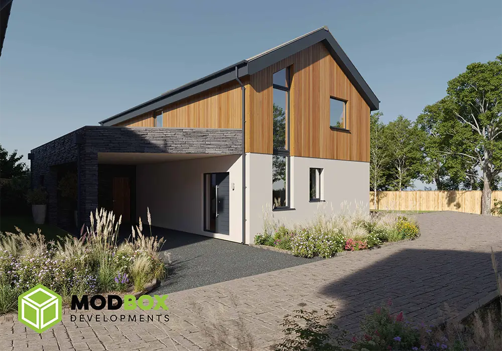 Constructed with high-quality materials, these homes feature a striking combination of timber cladding, stone, and white render, complemented by slate roofs. The anthracite grey windows and doors enhance the sleek aesthetic, while the inclusion of a carport with an EV charge point and an external store and plant room ensures convenience and practicality.