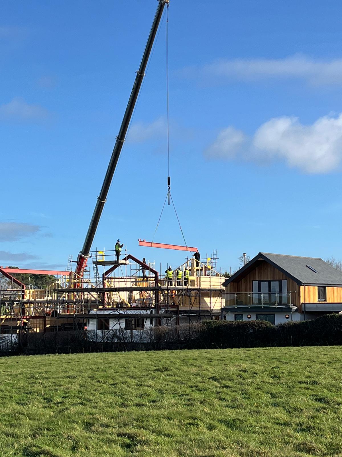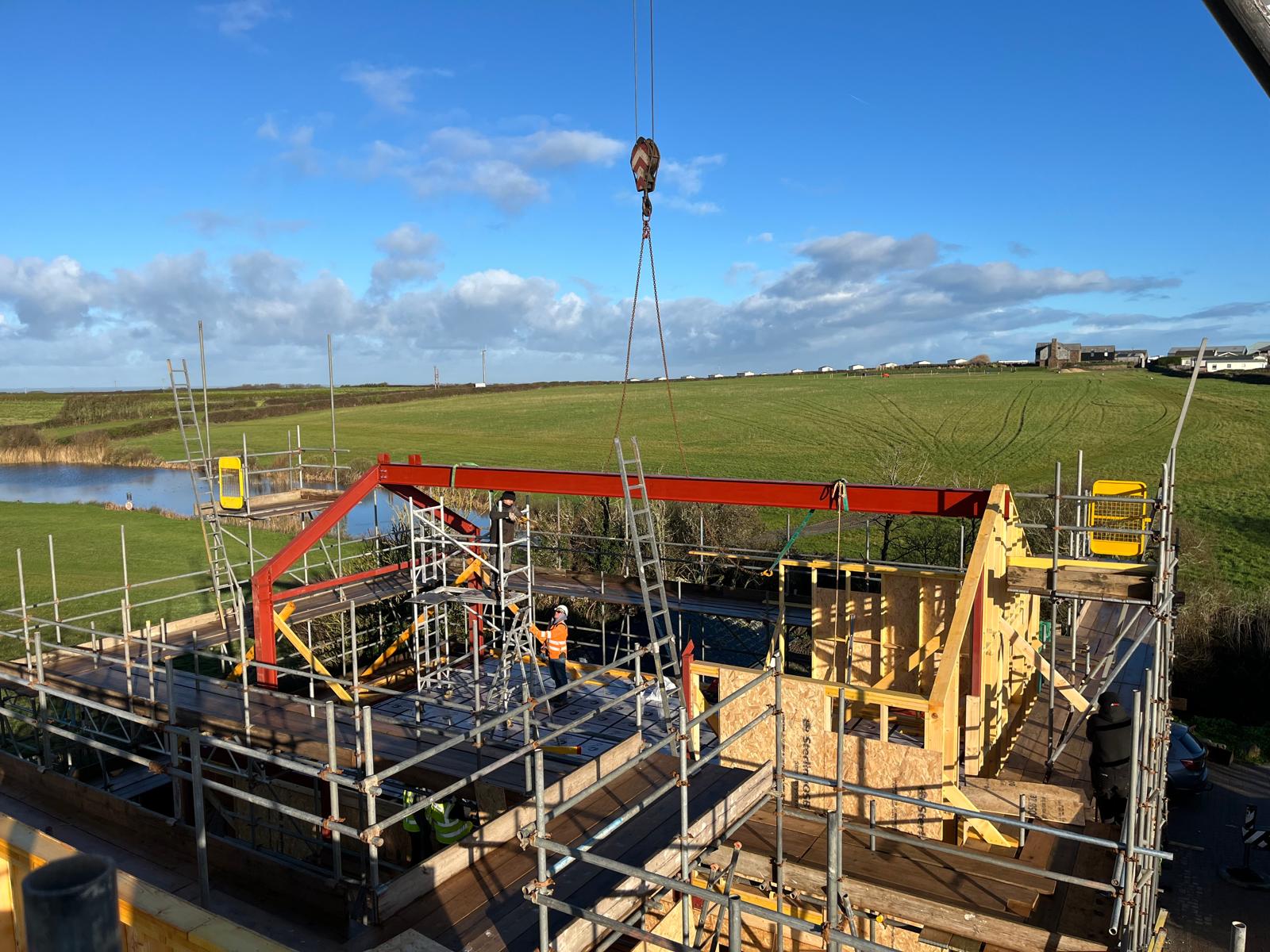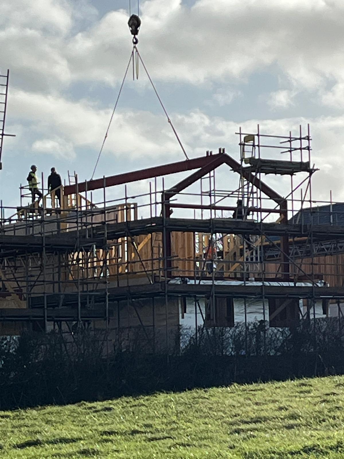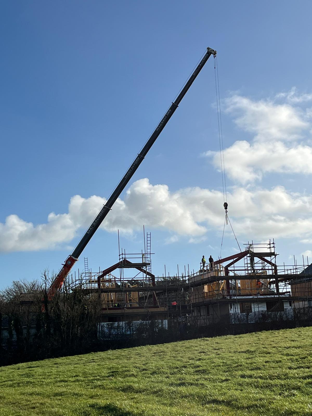 We employed the services of a Macsalvor 40 Tonne crane to lift the A Frame and ridge steels into place. Fortunately the sun was out and the wind was having a day off!