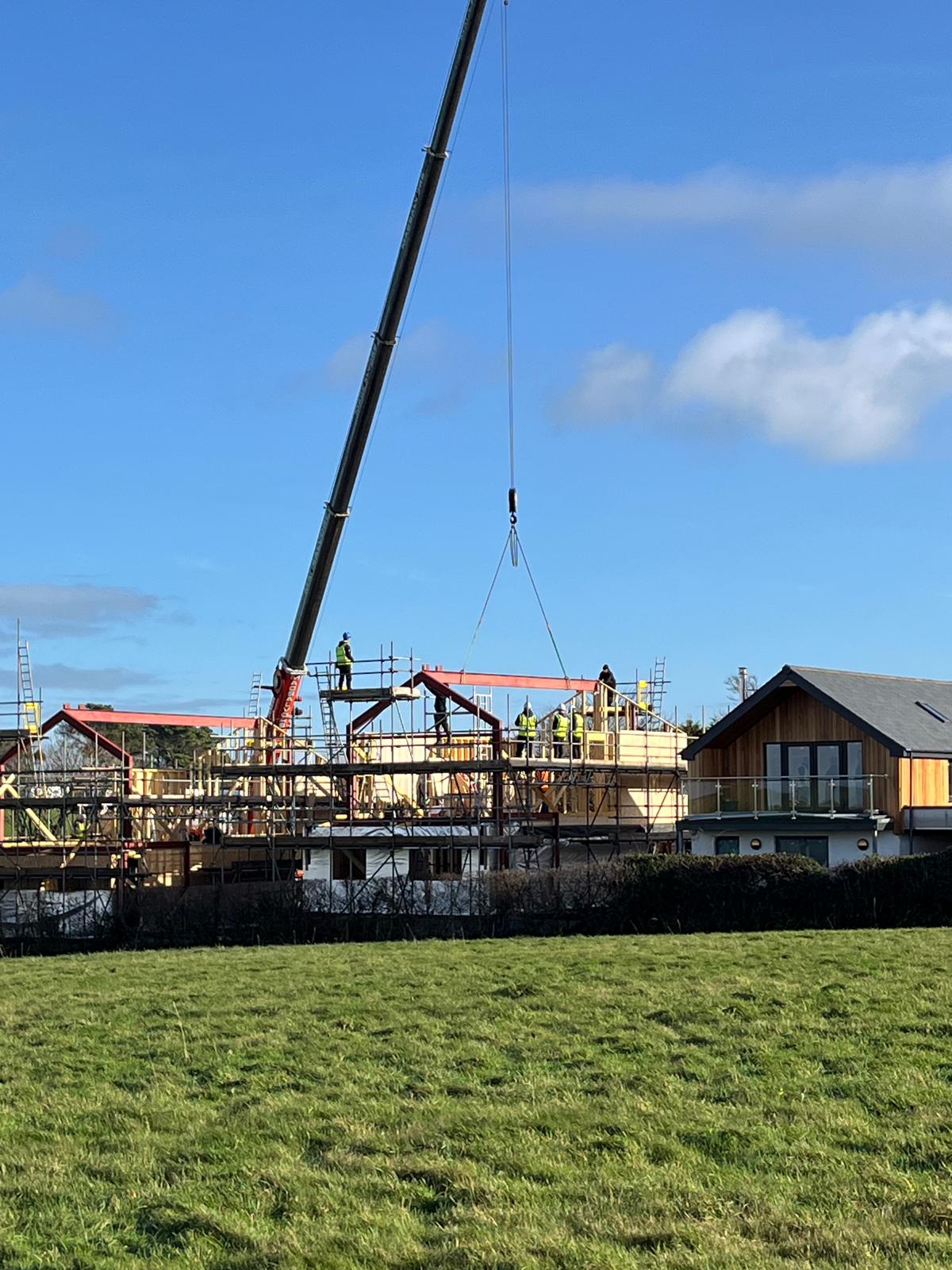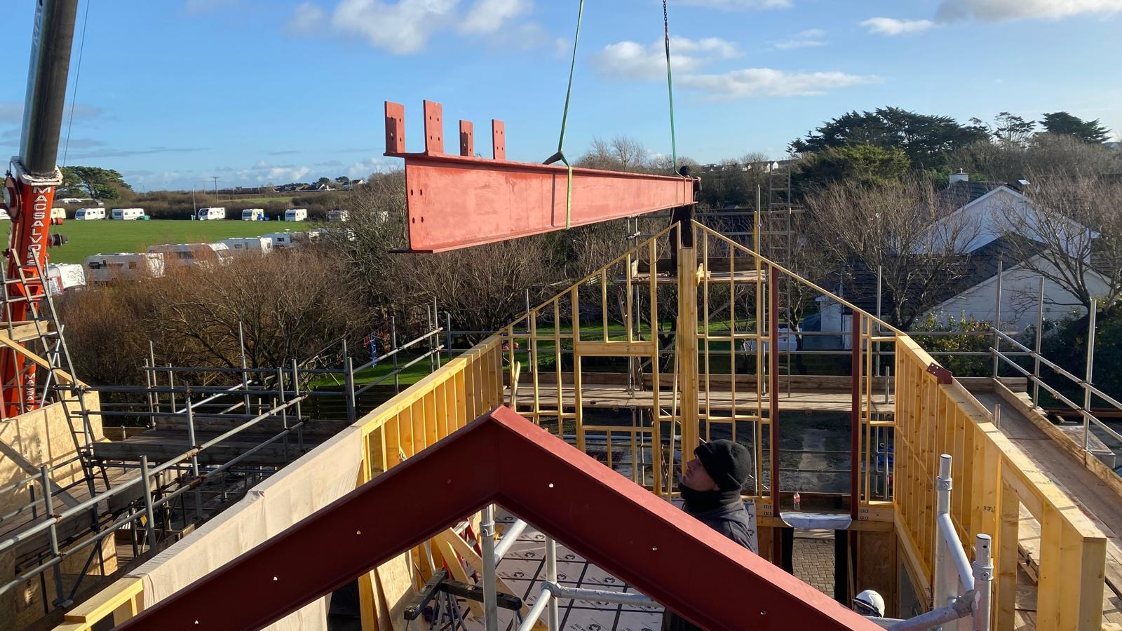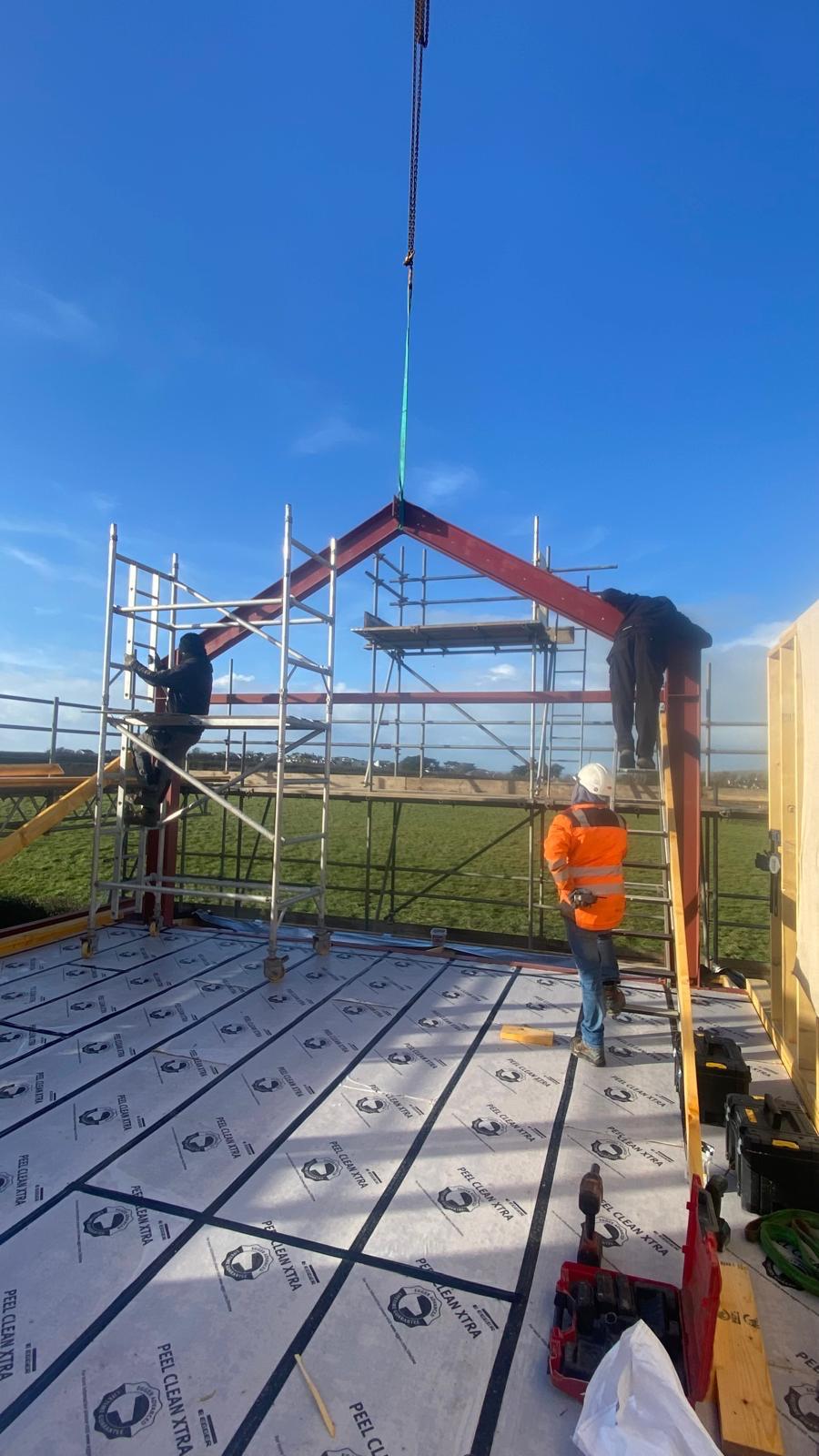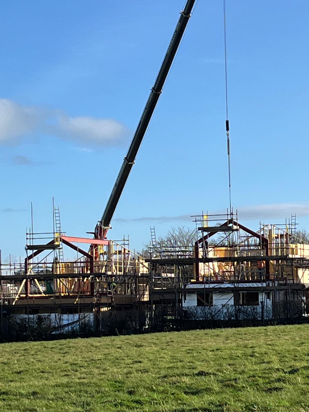 We employed the services of a Macsalvor 40 Tonne crane to lift the A Frame and ridge steels into place. Fortunately the sun was out and the wind was having a day off!