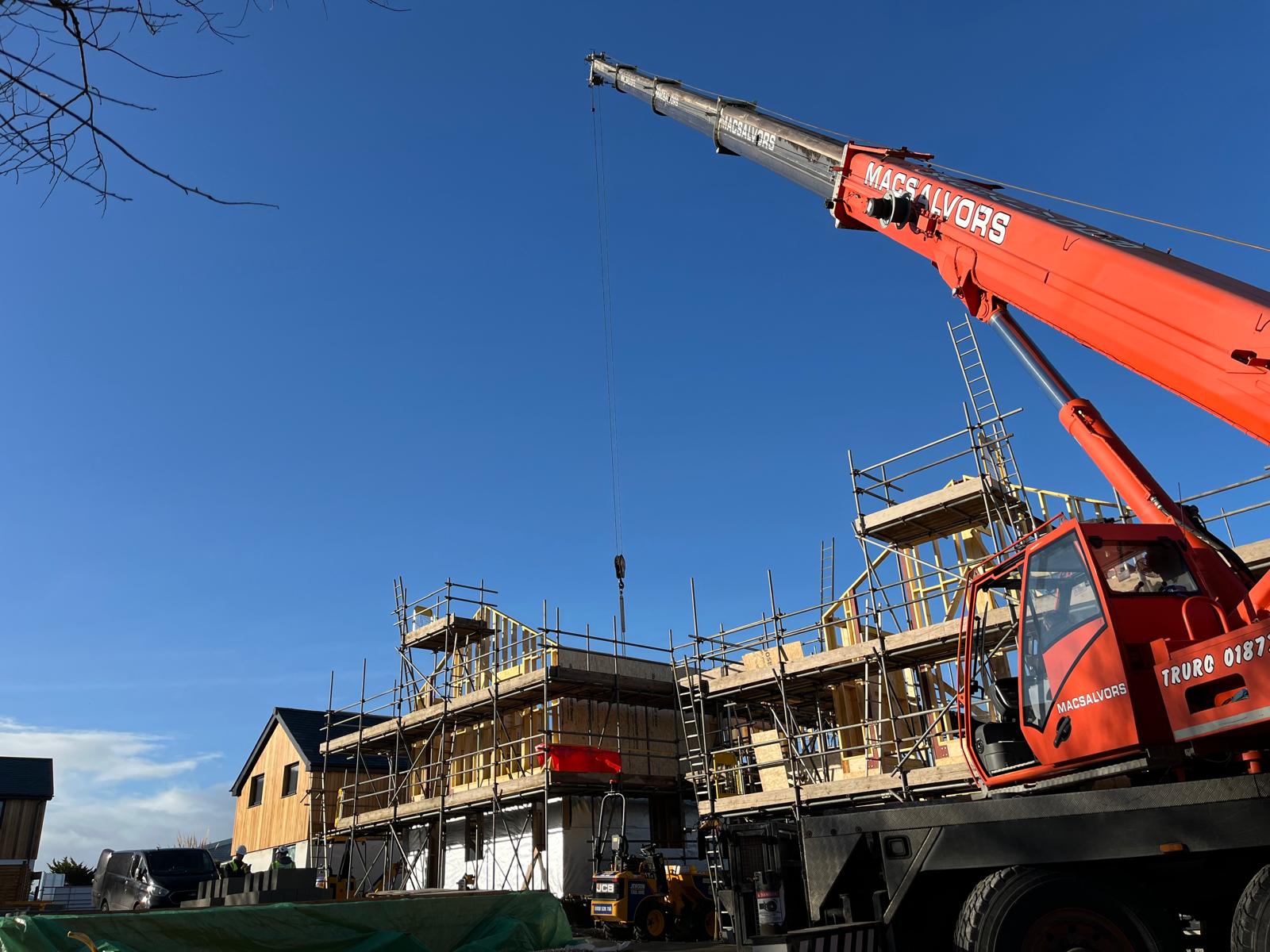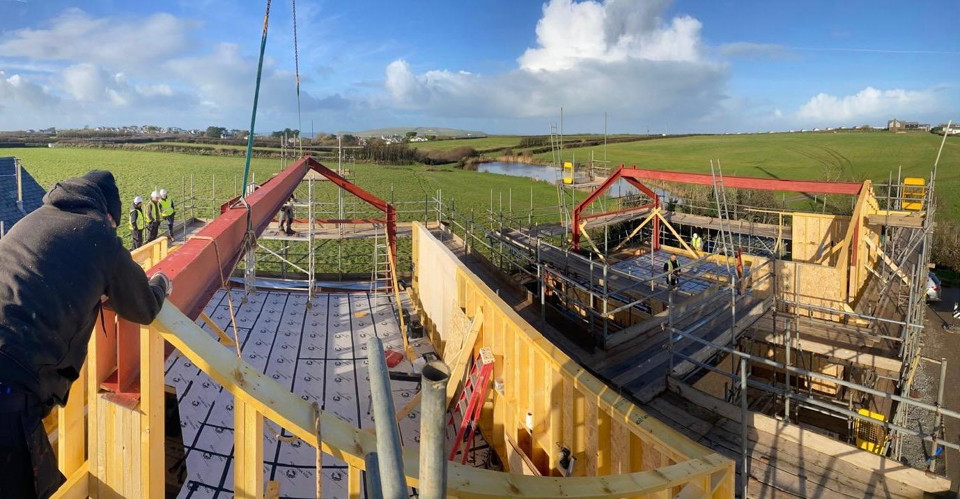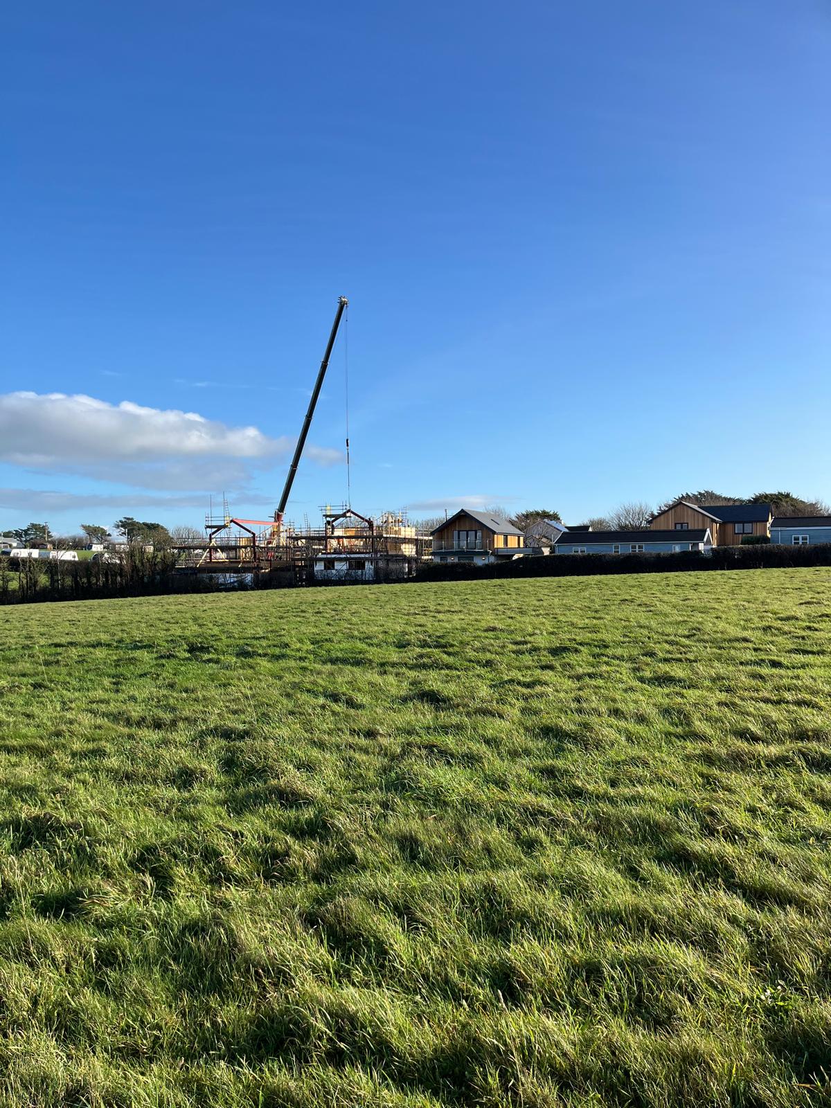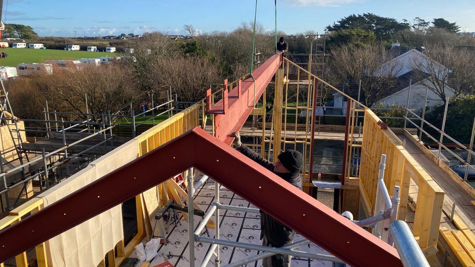 We employed the services of a Macsalvor 40 Tonne crane to lift the A Frame and ridge steels into place. Fortunately the sun was out and the wind was having a day off!